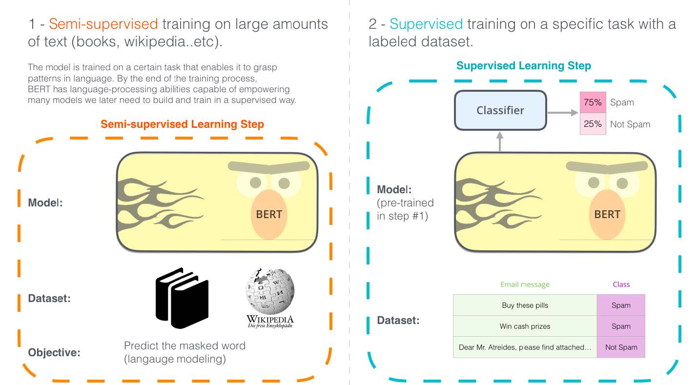 BERT și alte modele similare sunt antrenate într-un mod nesupravegheat, ceea ce înseamnă că nu au nevoie de date adnotate. Din acest motiv, poate fi antrenat pe cantități mult mai mari de date, care pot fi obținute prin crawling sau din cărți. Alte modele NLP au nevoie de învățare supravegheată, deci ar avea nevoie de date adnotate de oameni cu categoria corespunzătoare pentru clasificarea textului sau de entitățile care le conțin pentru recunoașterea entităților numite.