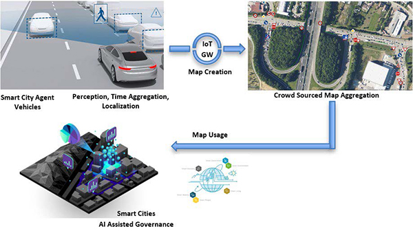 În exemplul de mai sus un astfel de agent trimite către cloud obiecte statice și în mișcare care vor fi stocate și analizate automat cu obiective concrete în dezvoltarea de funcții avansate, prin vizualizare intuitivă a hărții și statisticilor sau identificarea automată a unor scenarii ori evenimente de interes. Exemple de astfel de informații și servicii sunt: monitorizarea stării de degradare a infrastructurii, planuri de urbanism bazate pe măsurători statistice, gradul de poluare sau densitatea traficului, comportamentului participanților la trafic și multe altele. Unele dintre acestea pot fi integrate cu alte sisteme dintr-un oraș inteligent prezente deja (ex.: semafoare inteligente).