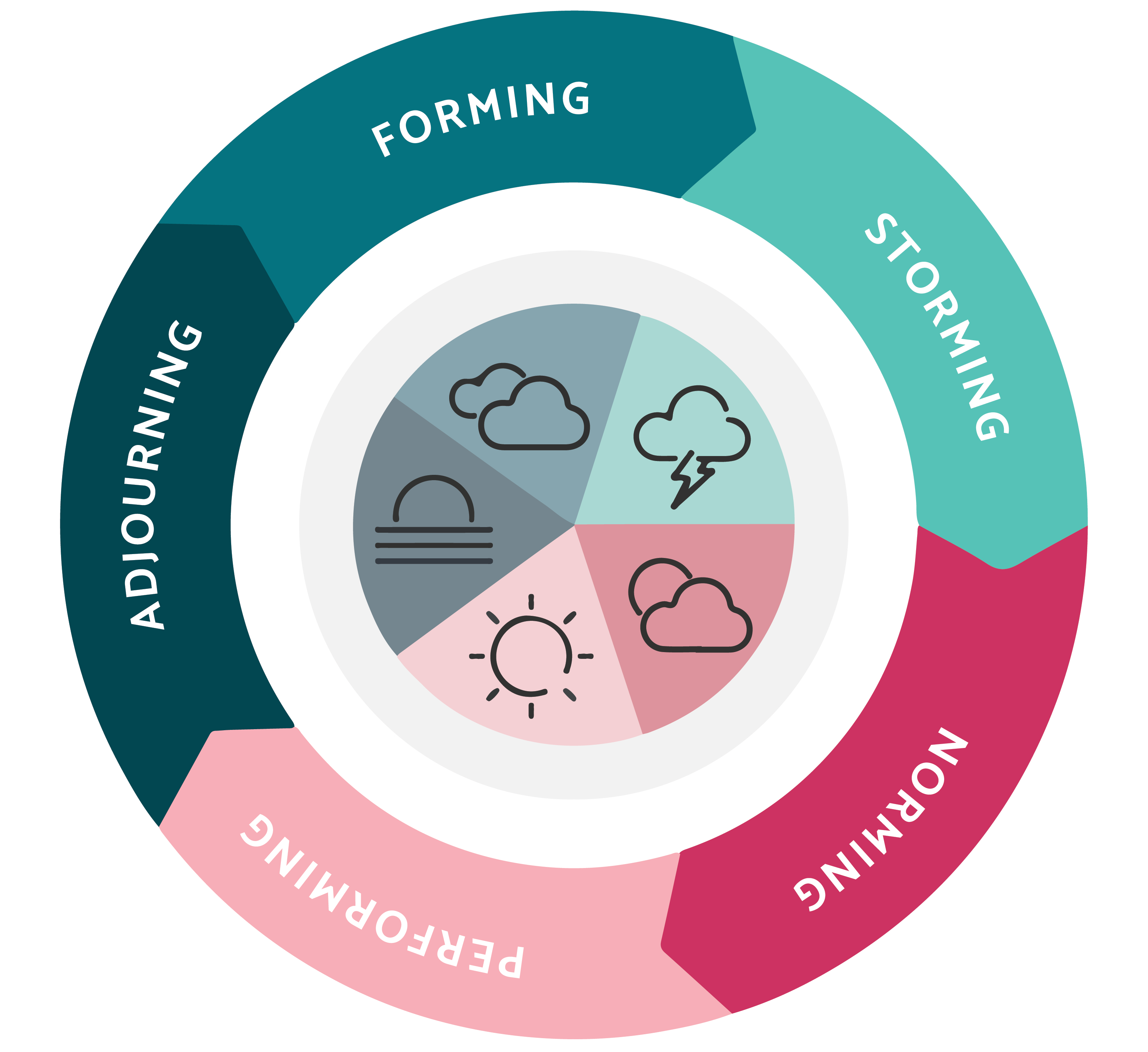 Acest proces a fost cel mai bine conturat pentru prima dată de Bruce Tuckman, cercetător american în psihologie. Acesta, în 1965, a configurat modelul "forming-storming-norming-performing". Tuckman consideră că fiecare etapă are caracteristici proprii. A denumit perioada de început, "Forming", drept o perioadă de cunoaștere când echipa se întâlnește, se familiarizează cu proiectul și începe alocarea primelor taskuri. Totodată, a menționat că în acest pas membrii echipei tind să lucreze mai mult individual și toată lumea își arată cea mai frumoasă latură.