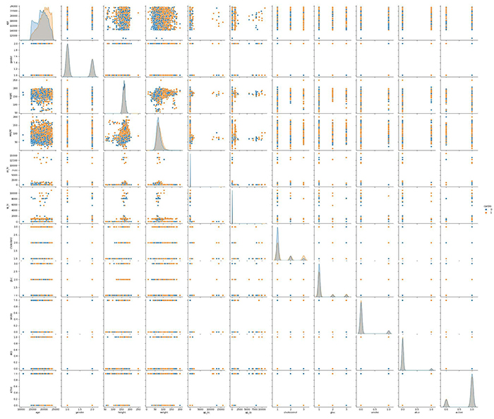 Scopul inițial al acestui set de date a fost acela de a urmări informațiile despre pacienți și de a vedea ce informații medicale pot fi indici clari ai unei boli de inimă. Ar trebui să se observe instant varietatea de factori care sunt luați în considerare atunci când se diagnostichează prezența unei astfel de boli, reprezentată printr-o valoare binară în coloana "cardio" a setului de date. Și, din păcate, nu pare să existe o distincție clară între persoanele cu boli de inimă și cele fără. Luând în considerare cele 11 variabile independente din tabel, am putea obține un total de 112 diagrame, care ne-ar putea ajuta să înțelegem care sunt factorii determinanți care favorizează apariția bolilor de inimă.