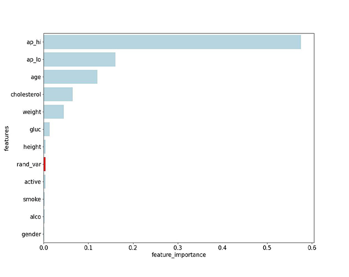 Graficul de mai sus ne arată, în ordinea descrescătoare a relevanței, factorii determinanți care cauzează boli de inimă. "rand_var" este o variabilă aleatorie care este utilizată pentru a stabili dacă un factor este, de fapt, determinant sau nu. Astfel, putem observa că, în mod surprinzător, nivelul de activitate fizică, obiceiul de a fuma, consumul de alcool și sexul nu sunt printre factorii determinați.
