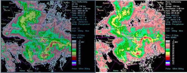 Figura 3 - Câmp de reflectivitate la prima elevație, radar WSR 98D Medgidia, 28.08.2004 . Stânga : ora 09.02 UTC, structura super-celulară în apropiere de Constanța, care a produs tromba de la Mamaia și ecoul arcuit (bow-echo) aflat pe mare. Dreapta : fuzionarea celor două structuri convective (12) (sursa : ANM)