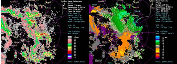 Figura 4 - Date radar Medgidia, 28.08.2004, ora 14.36 UTC. Stânga: reflectivitatea la prima elevație, cu două supercelule în nordul imaginii, din care una cu reflectivitate foarte mare, peste 65 dBZ, în zona comunei Pantelimon și o structura arcuită (bow-echo) în apropiere de litoral. Dreapta : câmp de viteză Doppler, cu evidențierea structurii mezoscalare supercelulare (12) (sursa : ANM)