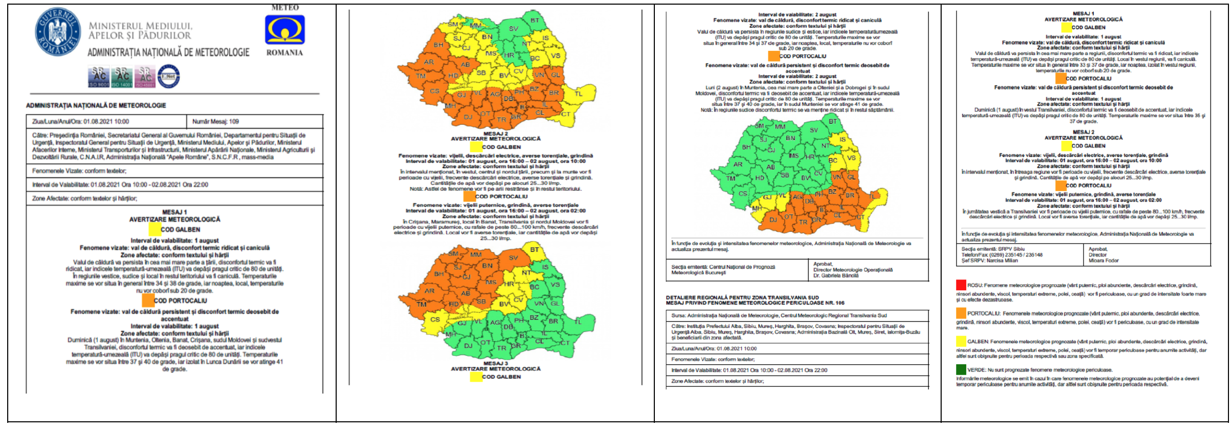 Dacă primele avertizări aveau forma mai simplă din Figura 1, acestea nu includeau codurile de culoare și erau emise de fiecare Serviciu Regional de Prognoză a Vremii (SRPV) pentru regiunea deservită, în timp forma acestora s-a modificat, incluzând acum atât mesajul general emis de Centrul Național de Prognoze Meteorologice (CNPM), cât și Detalierea regională emisă la nivel de SRPV, așa cum se vede în Figura 2.
