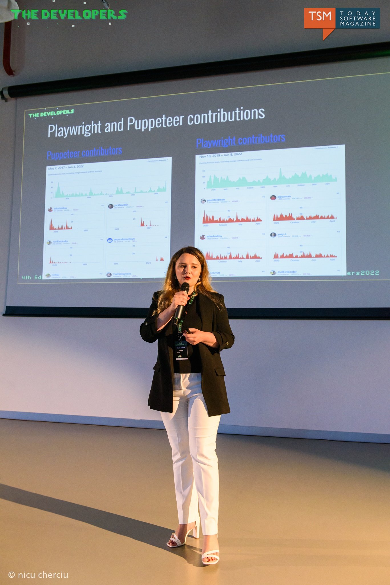 Playright este o librărie open source care se bazează pe NodeJS. Este disponibilă cross-platform (Windows, Linux, MacOS) și cross-language (JavaScript, Typescript, Java, Python și .NET). De asemenea, este cross-browser (Chromium, Firefox și WebKit). Roxana a arătat câteva exemple practice de folosire a acestuia.