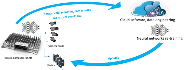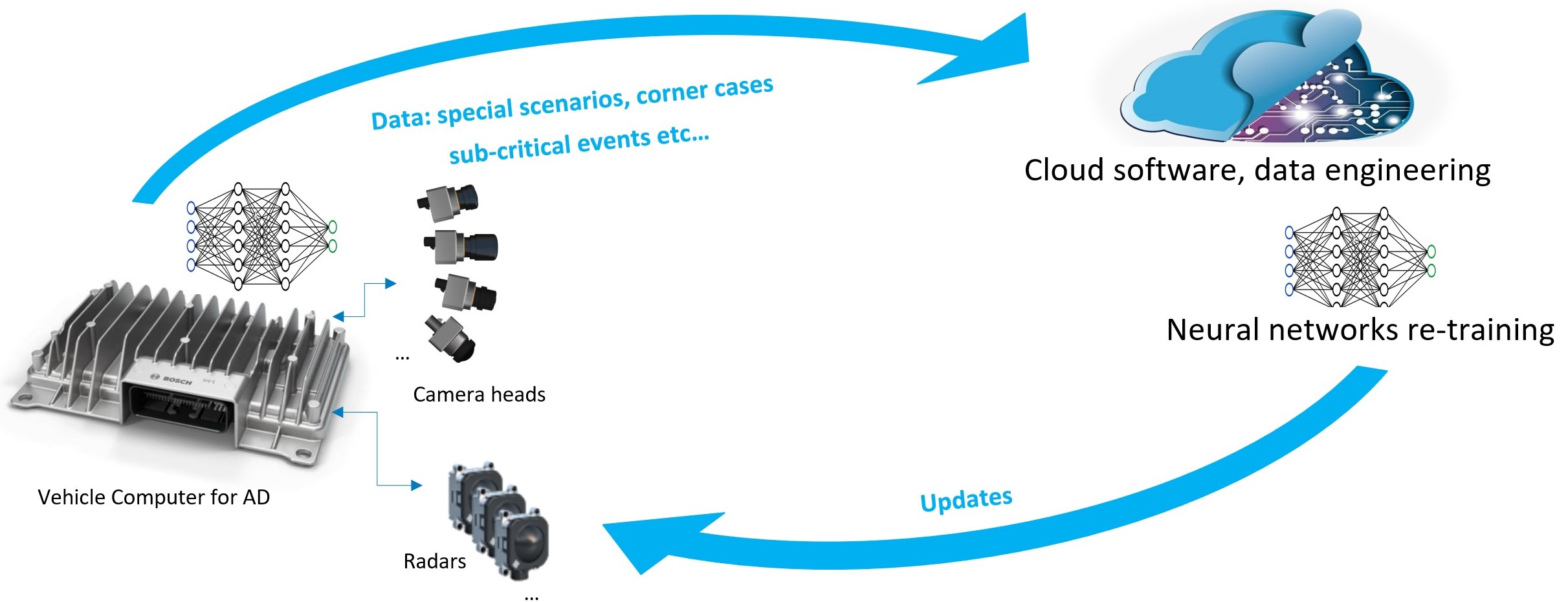Pentru a apropia cât mai mult distribuția seturilor de date de antrenare de distribuția datelor de intrare în mediul de operare, activăm posibilitatea de a colecta date din mediul de operare și de a colecta aceste date prin intermediul unor sisteme de conectivitate dintre mașină și cloud. Rețelele neuronale se re-antrenează pe baza noilor date și pe a distribui un update cu rezultatul (Figura 6 - Data loop).