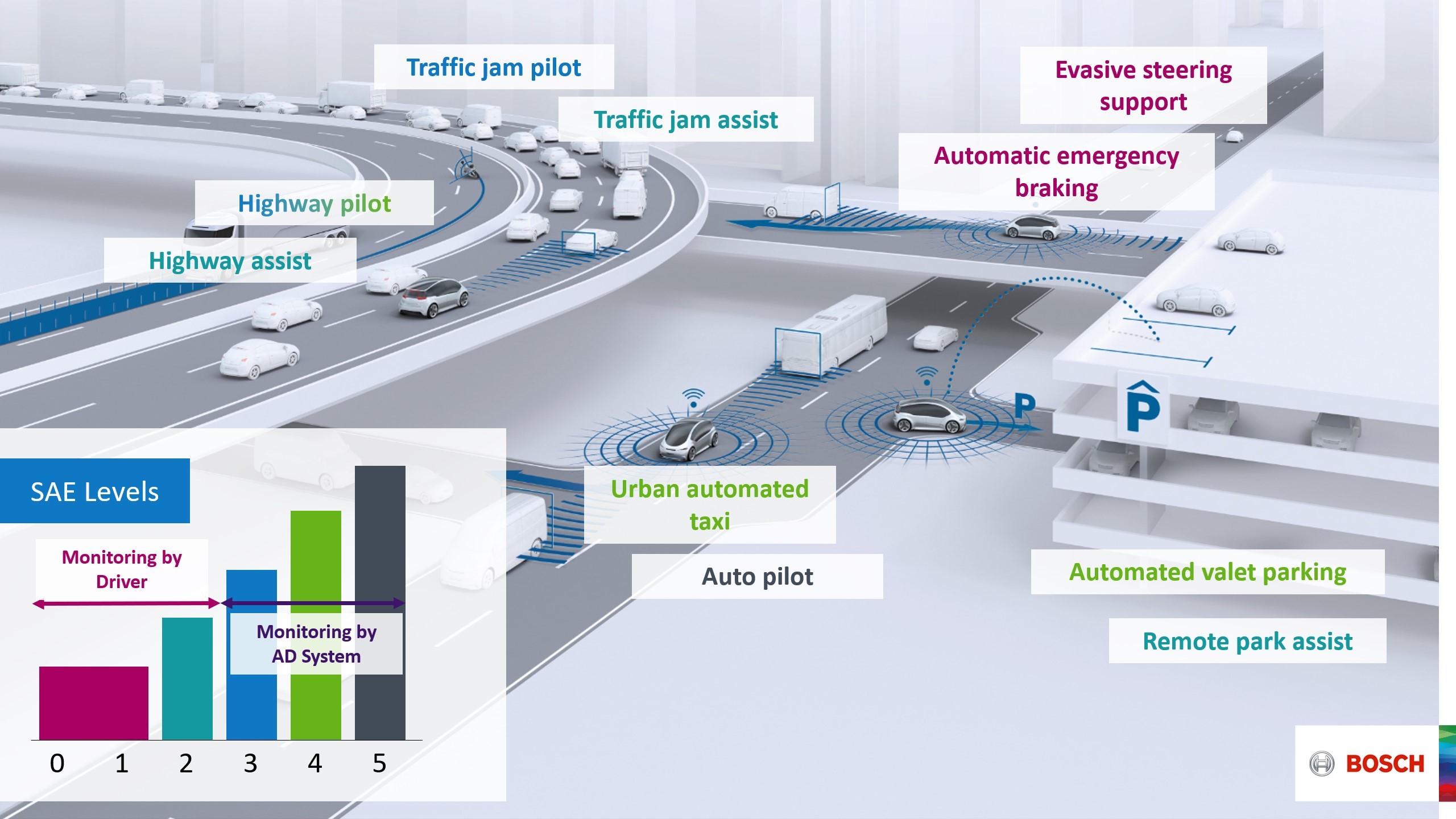 Este deja bine-cunoscut faptul că sistemele de conducere automată pot fi conceptual împărțite în șase niveluri în funcție de gradul de implicare necesar din partea șoferului (Figura 1). Un sistem de conducere automată de nivel 2 presupune o supervizare permanentă din partea șoferului, chiar dacă mașina este controlată lateral și longitudinal în mod automatizat. Trecerea la nivel 3 implică trecerea responsabilității de a conduce de la șofer la sistemul de conducere automată, cu precondiția ca șoferul să fie pregătit să preia controlul la un anumit interval de timp după ce este notificat să facă acest lucru.