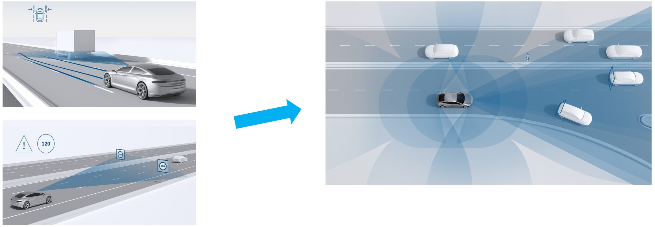În primul rând numărul de senzori cu care este echipată o mașină este în continuă creștere, fie că este vorba de senzori video, RADAR sau ultrasunete. Dacă dotările curente se bazează pe o cameră frontală, activitățile curente de cercetare și dezvoltare implică sisteme de percepție 360° (Figura 2) având un set de camere frontale, cu diverse proprietăți optice pentru a face posibilă percepția la diferite distanțe: camere orientate în spate, camere laterale cu diverse orientări. Spre exemplu, camerele poziționate lateral și orientate invers direcției de mers permit depășiri automate. Este important, de asemenea, alegerea senzorilor video și a lentilelor asociate pentru a obține percepția la distanțele dorite. De exemplu, pe baza informației de la un senzor video cu o anumită rezoluție, având un unghi mic de deschidere și o distanță focală mare, putem detecta obiecte la distanțe mai mari decât cu un senzor având aceeași rezoluție dar un unghi de deschidere mai mare și o distanță focală mai mică.