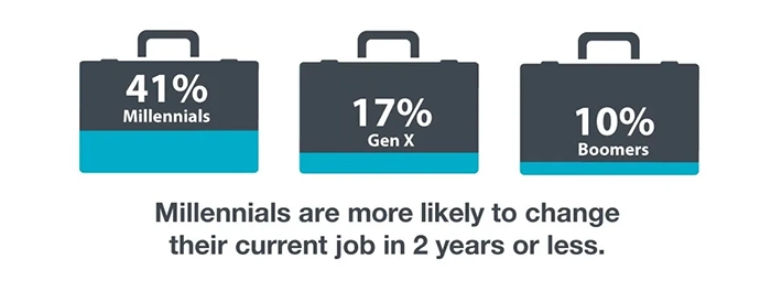 Cea mai îngrijorătoare statistica este că 41% dintre mileniali se așteaptă să rămână la locul lor de muncă actual timp de doi ani sau mai puțin (comparativ cu 17% din generația X şi 10% din boomers). Aceștia nu sunt la fel de angajați față de viitorul pe termen lung al companiilor comparativ cu generațiile precedente, și de aici nevoia de lideri puternici care să îi înțeleagă și să le pună în valoare calitățile.
