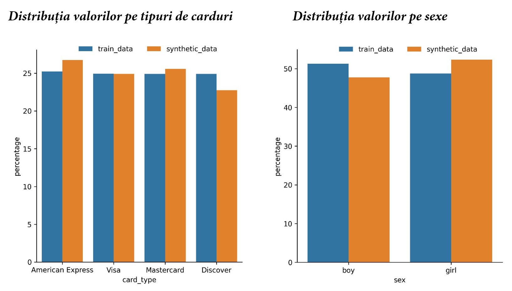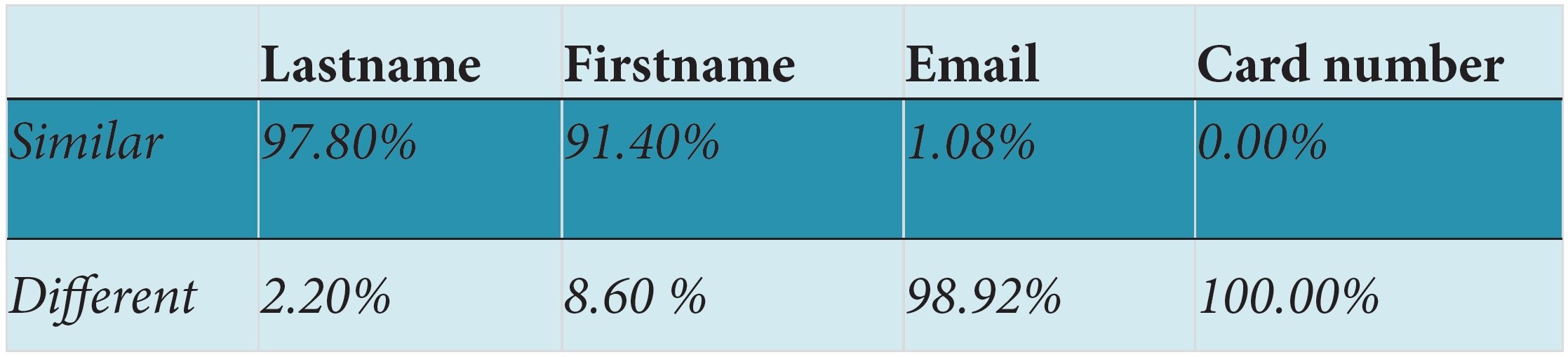 Pentru a aprofunda investigarea relației dintre datele din modelul prezentat și datele sintetice, am verificat, de asemenea, corespondențele exacte ale coloanelor. Putem vedea că modelul nu numai că a mixat unele dintre numele și prenumele pentru a crea noi e-mailuri, ci a generat și nume noi. De asemenea, autenticitatea este de 100% pentru numerele de card generate.