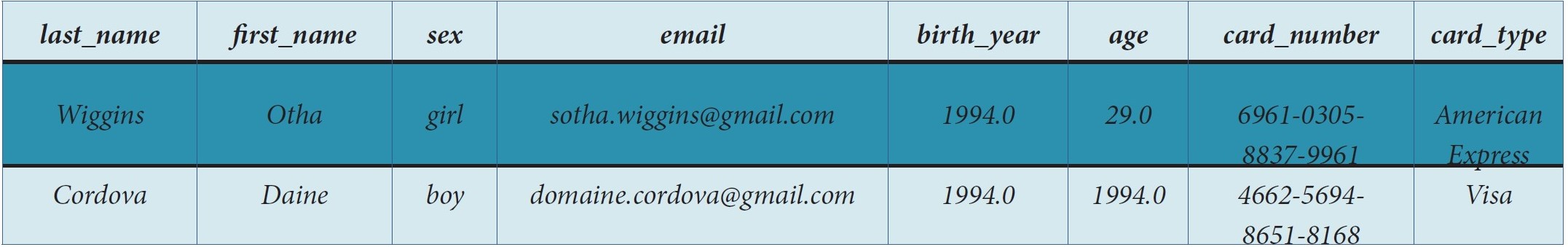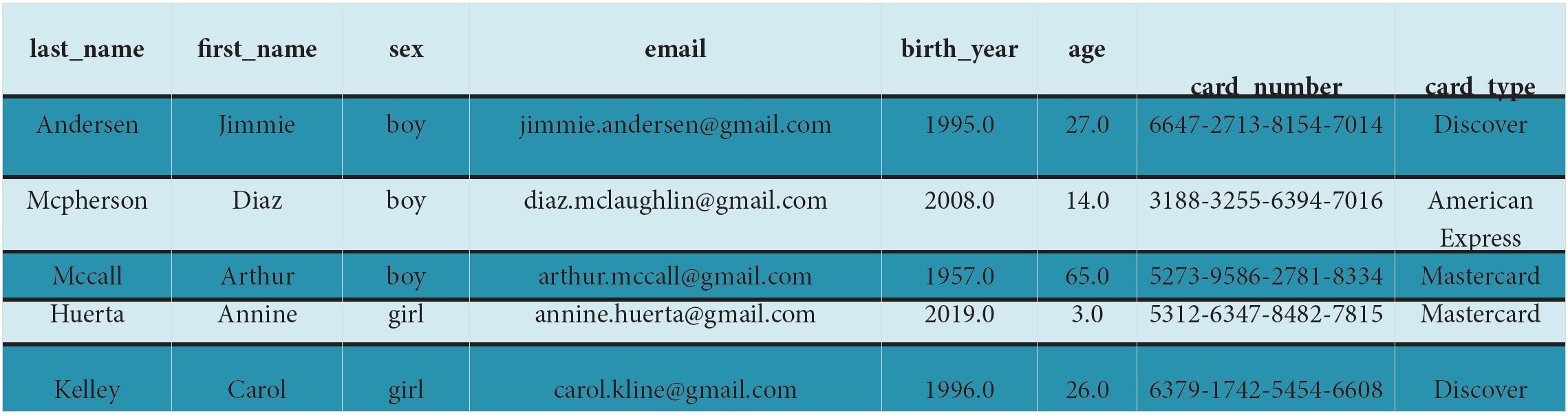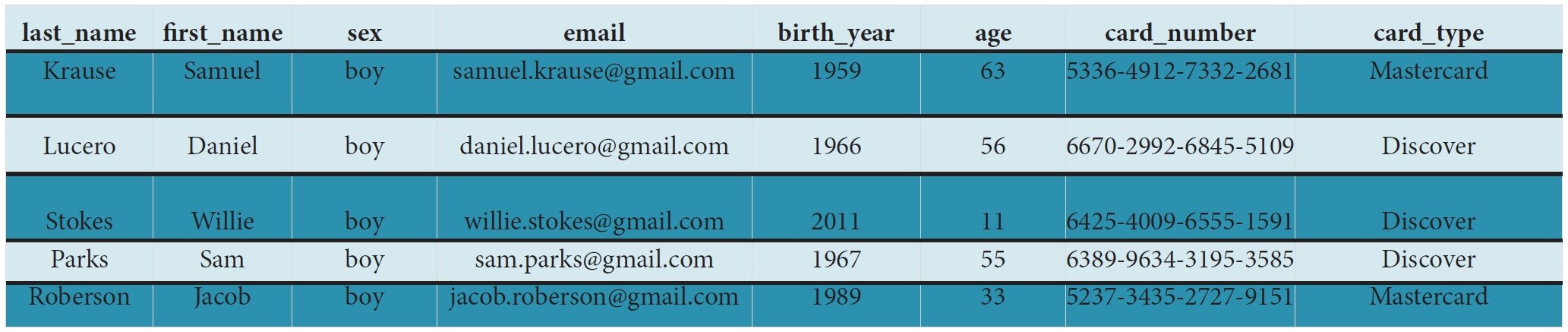 Coloana card_number a fost generată prin definirea unui șir de 19 caractere, conținând 4 grupuri, fiecare cu 4 cifre, separate prin "-". Prima cifră din primul grup este un număr din setul {3,4,5,6}. De exemplu: 6789-0123-4567-8910.