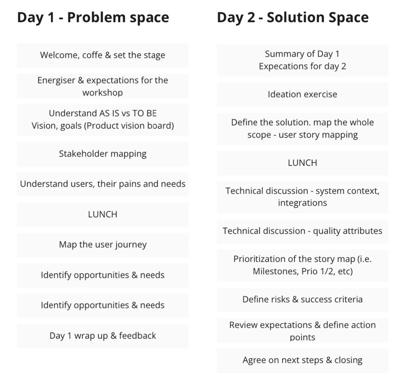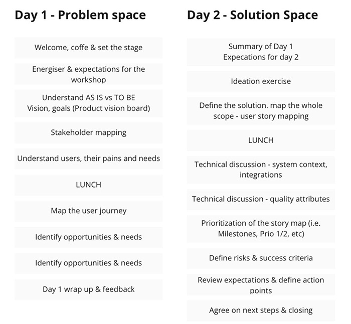 Pentru a vă ajuta să începeți, iată un exemplu de agendă pentru un atelier de lucru de două zile în persoană pentru o soluție greenfield dezvoltată de la 0. E important să începem de la un cadru mai larg și să facem zoom in pe măsură ce înaintăm în workshop.
