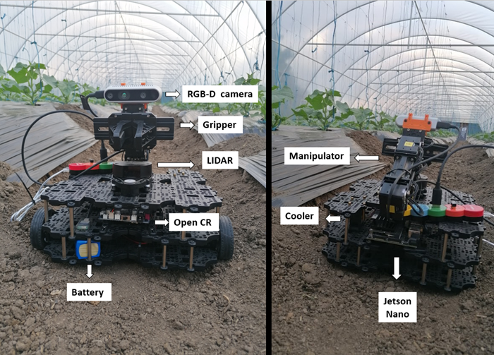 Robotul mobil este instalat în întregime pe platforma Turtlebot3 Waffle, dotată cu două roți comandate și o a treia situată în spate, fapt ce conferă stabilitate sistemului. Robotul nu are un sistem propriu de ghidaj, funcționarea acestuia datorându-se diferenței de viteză a roților comandate. Din cauza limitărilor de ordin material ale robotului, sunt luate în considerare ca potențiale medii operaționale doar spațiile închise, cum ar fi serele. Roboții folosiți în agricultură utilizează adesea pentru deplasare semnalele recepționate prin sistemul global de navigație prin satelit (GNSS), însă în cazul unei sere, acestea nu sunt suficient de puternice și de precise. În plus, distanța redusă dintre rândurile de plante nu permite nici cea mai mică eroare, care, altfel, ar conduce la deteriorarea culturii. Loc de testare și exemplu de rânduri apropiate de plante, în figura de mai jos.