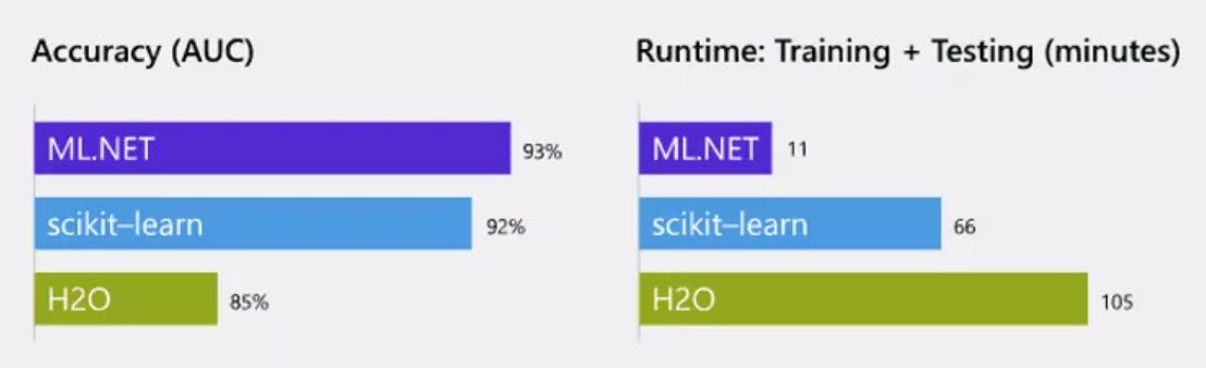 Using a 9GB Amazon review data set ML.NET trained a sentiment-analysis model with 95% accuracy. Other popular machine learning frameworks failed to process the dataset due to memory errors. Training on 10% of the data set, to let all the frameworks complete training, ML.NET demonstrated the highest speed and accuracy.