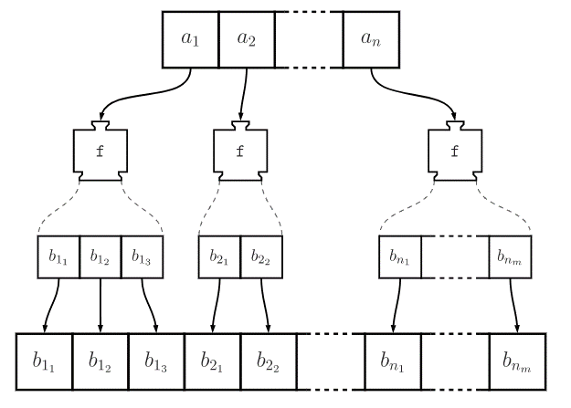 Aplică o funcție "f" asupra fiecărui element, iar toate sub elementele formate sunt flattened sau aplatizate într-o singură colecție, rezultatul nostru dorit. Poate fi definit ca trait: