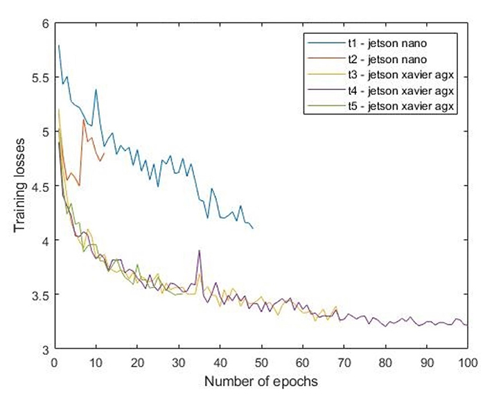 În primul rând, a fost testată rețeaua SSD-MobileNet v2. Utilizând TensorRT, se pot obține rezultate excelente de prelucrare în timp real: 16 cadre pe secundă (FPS). Cu toate acestea, performanțele în materie de detecție nu au fost satisfăcătoare; de aceea, am încercat să le îmbunătățim printr-un reglaj fin în cazul detectării fructelor. Astfel, pentru șapte tipuri dintre acestea (căpșune, portocale, mere, struguri, portocale, banane și pere), am făcut peste 5500 de fotografii, iar apoi am antrenat o nouă versiune a rețelei SSD-MobileNetv2, utilizând conceptul de transfer de cunoștințe și mediul de instruire furnizat de Nvidia. În total, au fost efectuate cinci antrenamente folosind două dispozitive diferite: Jetson Nano (două antrenamente), respectiv Jetson AGX Xavier (trei antrenamente), tabelul comparativ fiind prezentat în fig. [fig: ssd_results]. După cum reiese din grafic, pierderile medii ale rețelelor antrenate folosind Jetson Nano sunt mai mari încă de la început, în comparație cu cele ale rețelelor antrenate utilizând AGX Xavier. Nano nu este adecvat pentru antrenarea rețelelor neuronale profunde, deoarece unitatea de prelucrare grafică (GPU) nu are suficientă memorie și putere. Ca urmare, la un moment dat, se supraîncălzește și trebuie să se oprească. În schimb, Jetson AGX Xavier a avut un randament bun pe parcursul formării, însă s-a putut observa că, după atingerea unui anumit punct, rezultatele se plafonează, neputând fi îmbunătățite cu adevărat nici măcar după 30 de cicluri complete. Pentru antrenamente au fost utilizate următoarele configurații: