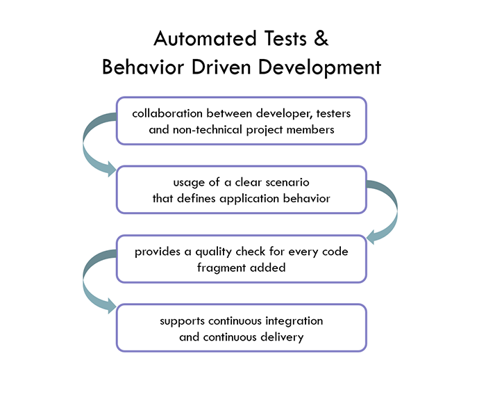 A avea scenarii bine exprimate, folosind logica "Given - When - Then" este un punct de plecare excelent pentru crearea scenariilor de testare automată. Acest lucru încurajează o strânsă colaborare între dezvoltatori, testeri și membrii non-tehnici ai echipei, ceea ce produce o înțelegere mai clară a comportamentului aplicației, precum și a criteriilor de acceptare necesare. În plus, acest lucru adaugă valoare integrării continue (continuous integration) și a verificării calității. De ce? De exemplu, cu integrarea continuă, testăm automat proiectul cu fiecare nouă modificare care este făcută sau feature adăugat. Acest lucru previne regresia și oferă feedback cu privire la posibilele modificări care pot afecta alte părți ale aplicației.