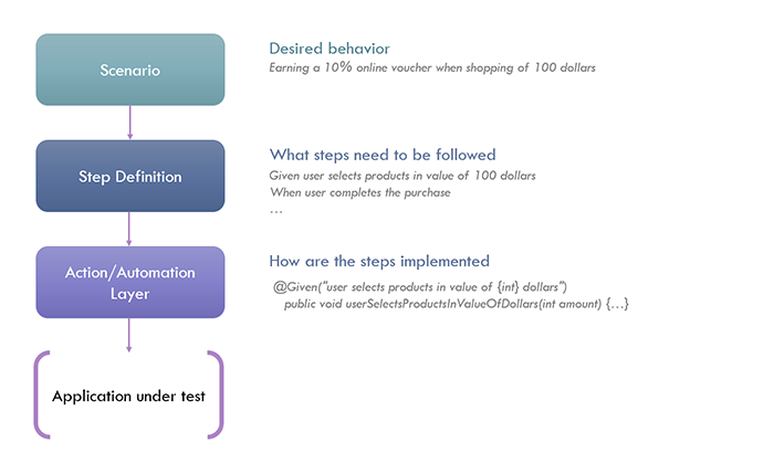 În timp ce scenariile descriu cerințele, definițiile pasului reprezintă o formă de divide et impera ( dezbină și cucerește). Beneficiul împărțirii cerinței în sarcini mici și independente este că acestea vor deveni reutilizabile în alte scenarii. Acest layer de definiție a pasului apelează layerul de automatizare a testului și rulează efectiv metodele necesare.