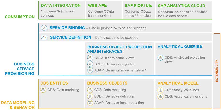 Prin comparație cu lumea clasică ABAP, în cadrul ABAP Cloud, există un model specializat de programare ce trebuie luat în calcul în cadrul procesului de dezvoltare al aplicațiilor, element cheie pentru ABAP Cloud așa cum l-am prezentat în anterior - ABAP RESTful Application Programming Model (RAP) - ce constă dintr-un set de concepte, tooluri, limbaje și paradigme ce permit un flux standardizat de dezvoltare în Eclipse IDE with ABAP Development Tools (ADT) a diferite tipuri de servicii și API-uri, precum servicii fundamentate pe Odata pentru dezvoltare UI consumate de aplicații SAP Fiori bazate pe SAP Fiori Elements sau chiar aplicații SAP Fiori-freestyle (read-only sau transactional draft/non-draft enabled). Mai includem și serviciile bazate pe Odata pentru expunere sub formă de Web APIs, dar și serviciile analitice configurate pe InA (SAP Information Access Protocol) consumate de diferite tooluri analitice (i.e. SAP Analytics Cloud, SAP WebDynpro Data Grid).