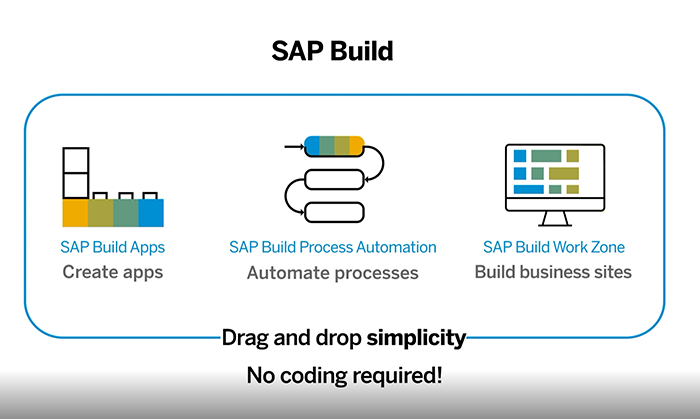Acest concept are deja o scurtă istorie și implementarea a început acum câțiva ani cu aplicația Build.me și a continuat în 2021 cu AppGyver. În versiunea Build.me era posibilă crearea unui prototip interactiv sau mock-up, cu mai multe pagini și funcționalitate de navigare, care respectă principiile de design Fiori. Erau posibile colaborarea pentru a primi feedback din partea stakeholderilor și crearea mai multor versiuni ale aplicației. Noul produs integrează trei aplicații: SAP Build Process Automation, SAP Build și SAP Build WorkZone.