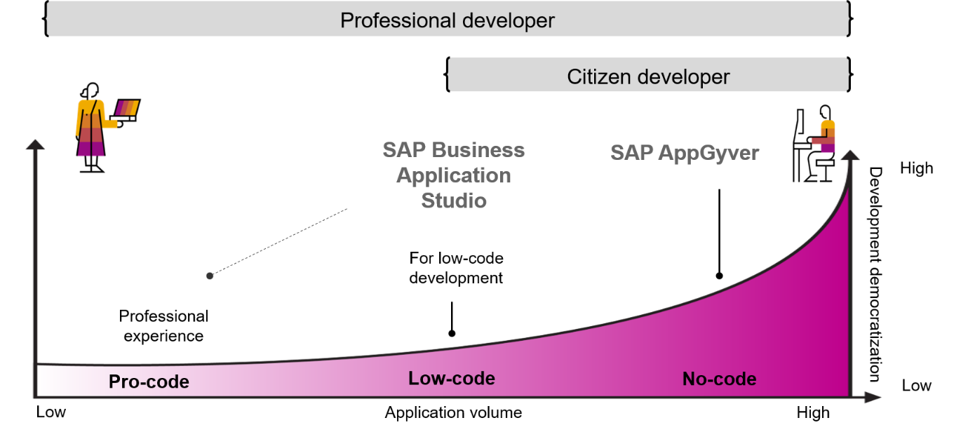 În primul rând, numărul programatorilor este limitat, aceștia fiind adesea implicați în proiecte care durează perioade îndelungate de timp. Folosind o platformă care automatizează scrierea codului, orice cetățean, care are acces la aceasta, poate să se concentreze pe proces și poate deveni programator cu un efort mic. Acest lucru este ilustrat în figura 1. Cetățeanul programator se poate folosi de un tool numit AppGyver, predecesorul lui SAP Build, pentru a dezvolta aplicații fără cunoștințe amănunțite despre codificare. Cu toate acestea, este nevoie de un programator profesionist pentru a aduce aplicația în producție sau pentru a codifica aplicații cu totul customizate.