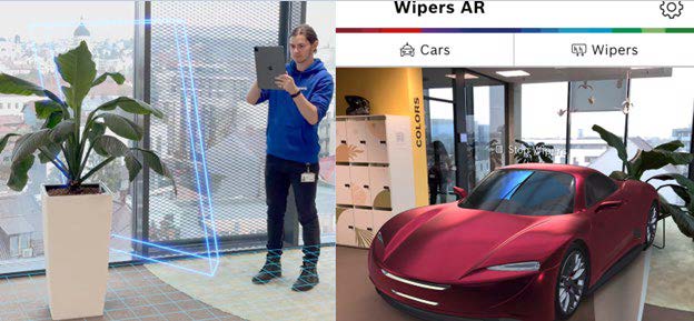 ARWipers este o aplicație de realitate augmentată ce permite utilizatorilor să vizualizeze în timp real orice tip de ștergător existent într-o bază de date largă de mașini. Există un server centralizat ce comunică cu baza de date ce conține modele 3D. De îndată ce utilizatorul selectează mașina și tipul de ștergător dorit, clientul, echipat cu tabletă cu suport pentru realitate augmentată, cere datele necesare de la server. În momentul în care acestea au fost aduse local, se intră în modul de vizualizare, unde se cere un spațiu larg, liber, se identifică acest spațiu și se amplasează mașina virtuală în spațiul real. De aici, utilizatorul poate vizualiza o gamă largă de ștergătoare.