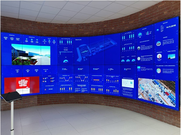 Hai să mergem la recepție! Aici vezi cel mai impresionant dashboard pe care îl avem în fabrica noastră. Scopul lui este atât afișarea informațiilor, cât și de a impresiona vizitatorul. O echipă întreagă a lucrat la crearea acestui afișor, au folosit React pentru a-l programa. O să vezi o multitudine de informații afișate despre ce și cât producem, câtă energie solară am generat, câtă apă am reciclat, câte piese defecte am produs și câte din ele puteau fi salvate. (Știi și tu că degeaba producem, dacă nu producem sustenabil.)