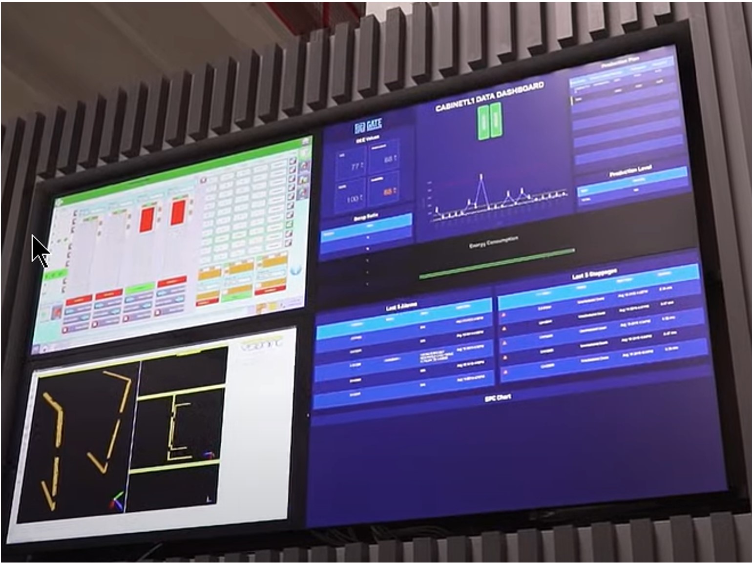 Vezi acele monitoare care sunt fixate pe tavan? Se numesc Andon Panels. Denumirea vine din limba japoneză, însemnând candelabru de hârtie. Poate avea mai multe forme: cele mai simple fiind luminile pe mașină care indică statusul mașinii, cele mai complicate sunt dashboardurile. Dashboardurile ca UX/UI sunt foarte bine gândite, arată cele mai importante informații legate de linia de producție. Acestea sunt afișate într-un mod minimalist, ca să fie cât mai ușor de înțeles de oricine. Orice perturbație pe linia de producție care apare aici, poate fi văzută, înțeleasă și remediată de aproape oricine de pe linia de producție. Andon dashboardurile arată statusul liniei: poți să vezi ce model se produce azi, OEE-ul liniei (Overall Equipment Efectiveness = Availability x Performance x Quality), care este cantitatea pe care linia o poate produce și unde suntem la momentul de față. Dacă cumva linia încetinește, cantitatea actuală devine mai mică decât cantitatea așteptată și apare o atenționare că ceva nu funcționează cum trebuie.