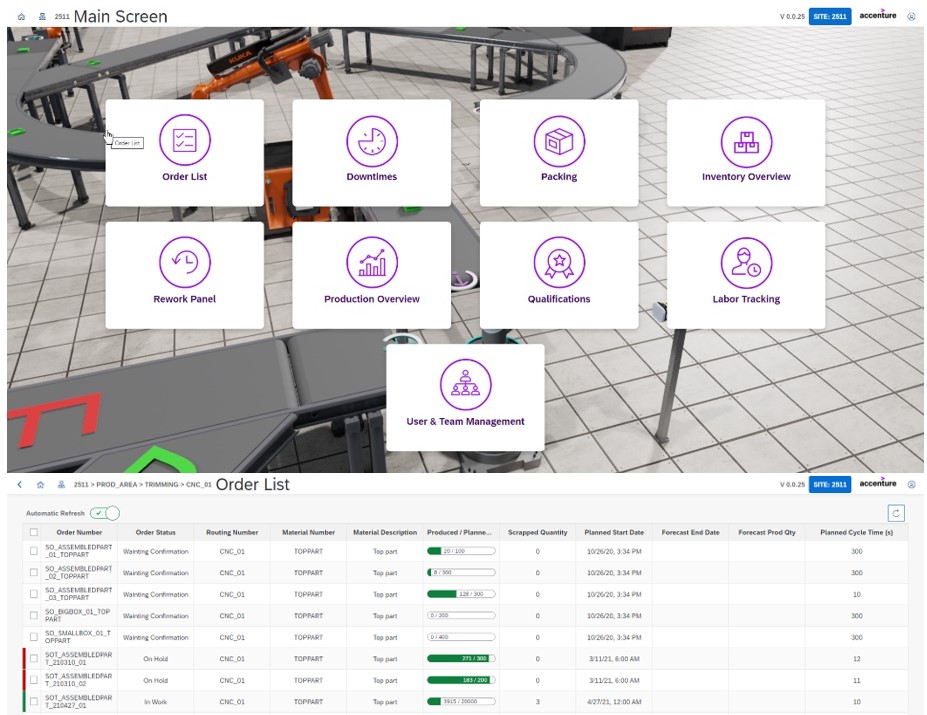 Dacă vii după mine, o să remarci două tipuri de panouri ce sunt folosite de operatori și team leaduri. Un tip este fix, celălalt este pe tablete, și este mobil, dar ambele afișează aceeași interfață. De aici, avem control asupra liniei de producție. Putem schimba ce se produce pe linie, putem chema un operator sau tehnician în caz de defecțiune, putem solicita instrucțiuni la fiecare pas al producției. Într-un cuvânt, avem vizibilitate totală asupra unei părți sau a întregii linii. Interfața se schimbă în funcție de cine îl folosește. Un operator nu va putea efectua aceleași operațiuni ca un team lead. Aceste schimbări se fac în funcție de cine este logat pe device-ul respectiv. Și aici interfața este curată, minimalistă, cu informații clare și precise, la fel și controalele. Ca tehnologie, la interfața pe Fig. 3, s-a folosit SAPUI5, ceea ce este un JavaScript framework, și librării UI, cu ajutorul cărora se pot crea aplicații web.