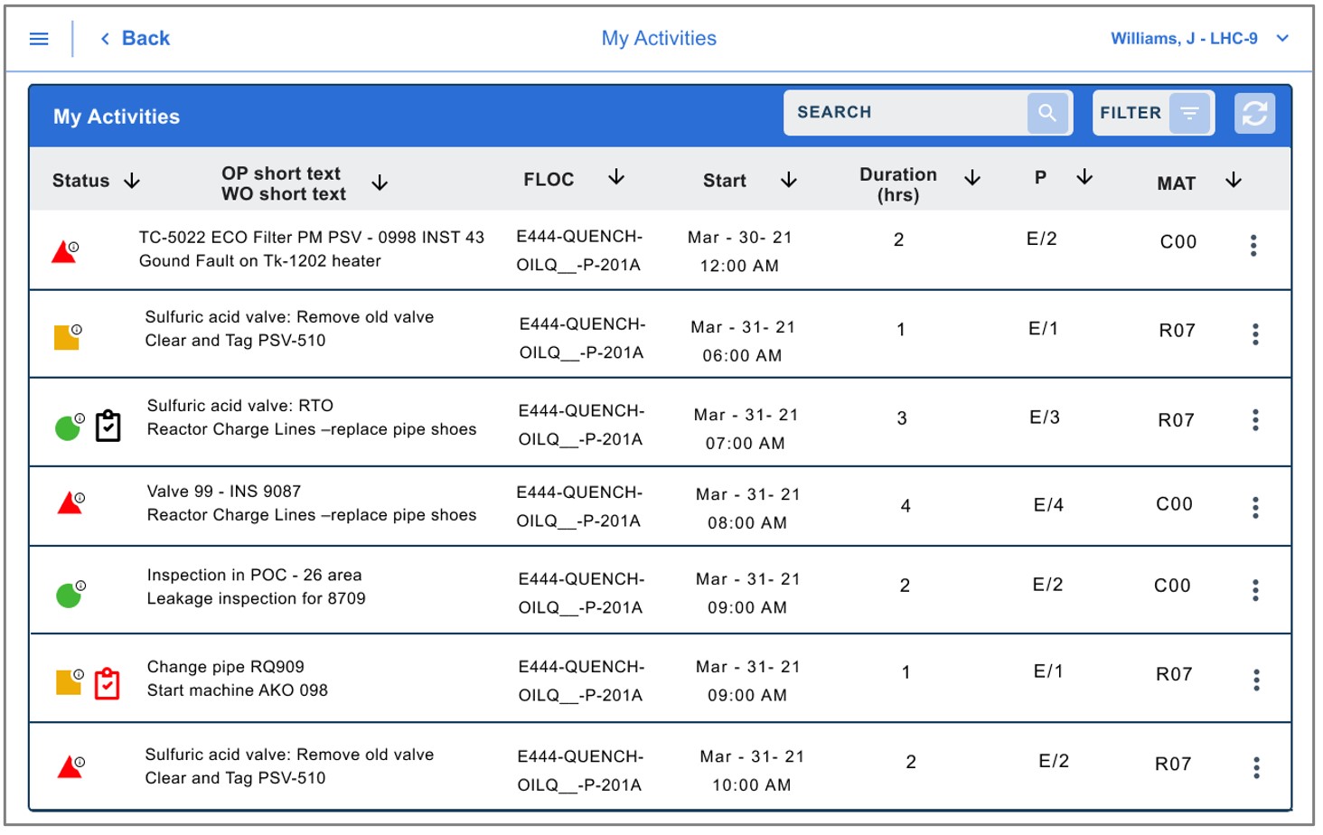 Ecranele de mai jos (varianta pentru tabletă și cel pentru telefon Android) ilustrează un tabel complex de unde fiecare muncitor poate afla care sunt sarcinile fiecărei zile, statusul acestora, descrierea scurtă, locația, durata, prioritatea. Toate acestea pot fi sortate și filtrate. Se folosesc iconițe și culori pentru a pune în evidență anumite elemente. Varianta pe telefon cu ecran mai mic conține aceeași elemente, folosind un sistem de cărți în loc de rânduri. Sortarea și filtrarea se găsesc în același meniu în acest caz.