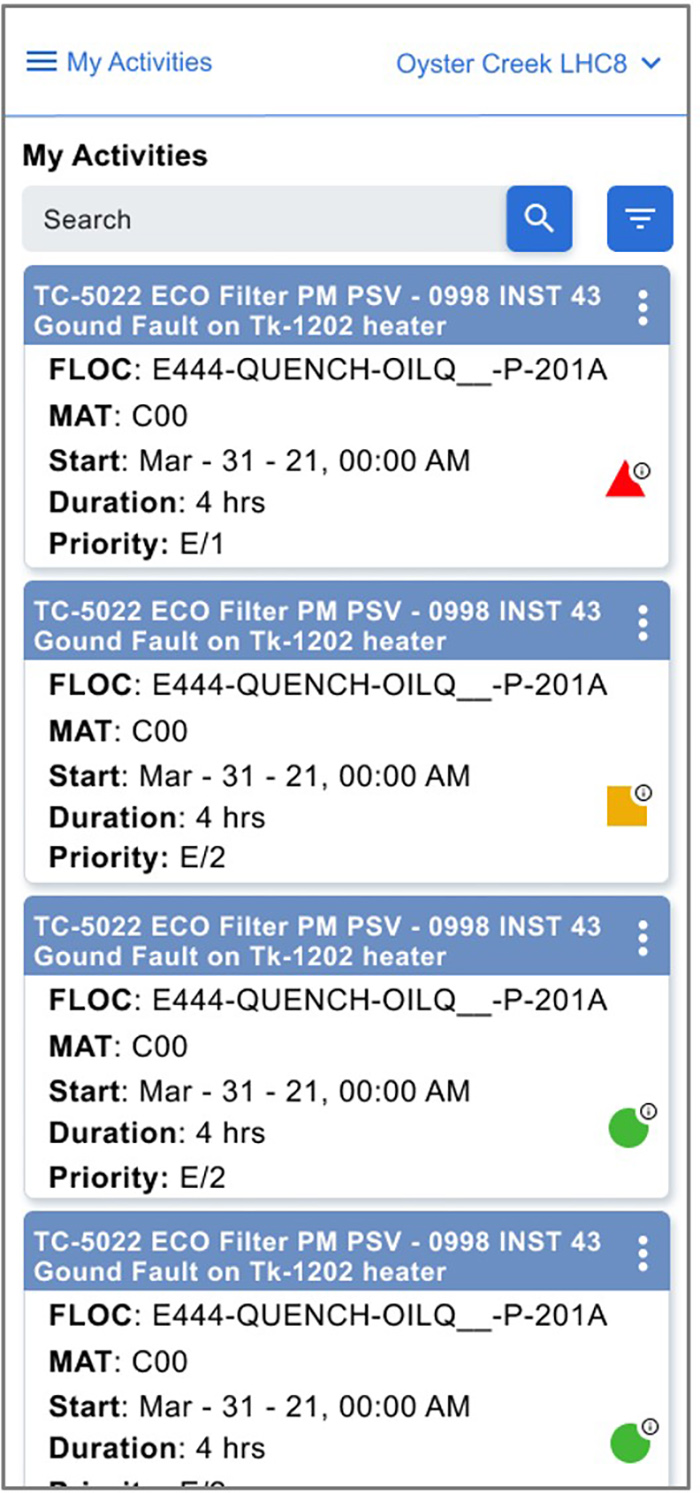 Exemplul de mai sus arată lista de echipamente, vizualizând fiecare obiect cu o imagine pentru a face mai ușor identificarea lor pe teren. Pagina de detalii conține o suită de iconițe care oferă informații asupra stării echipamentului, iar interacțiunile de pe pagină sunt limitate prin prezența unui număr limitat de butoane ușor de înțelese.