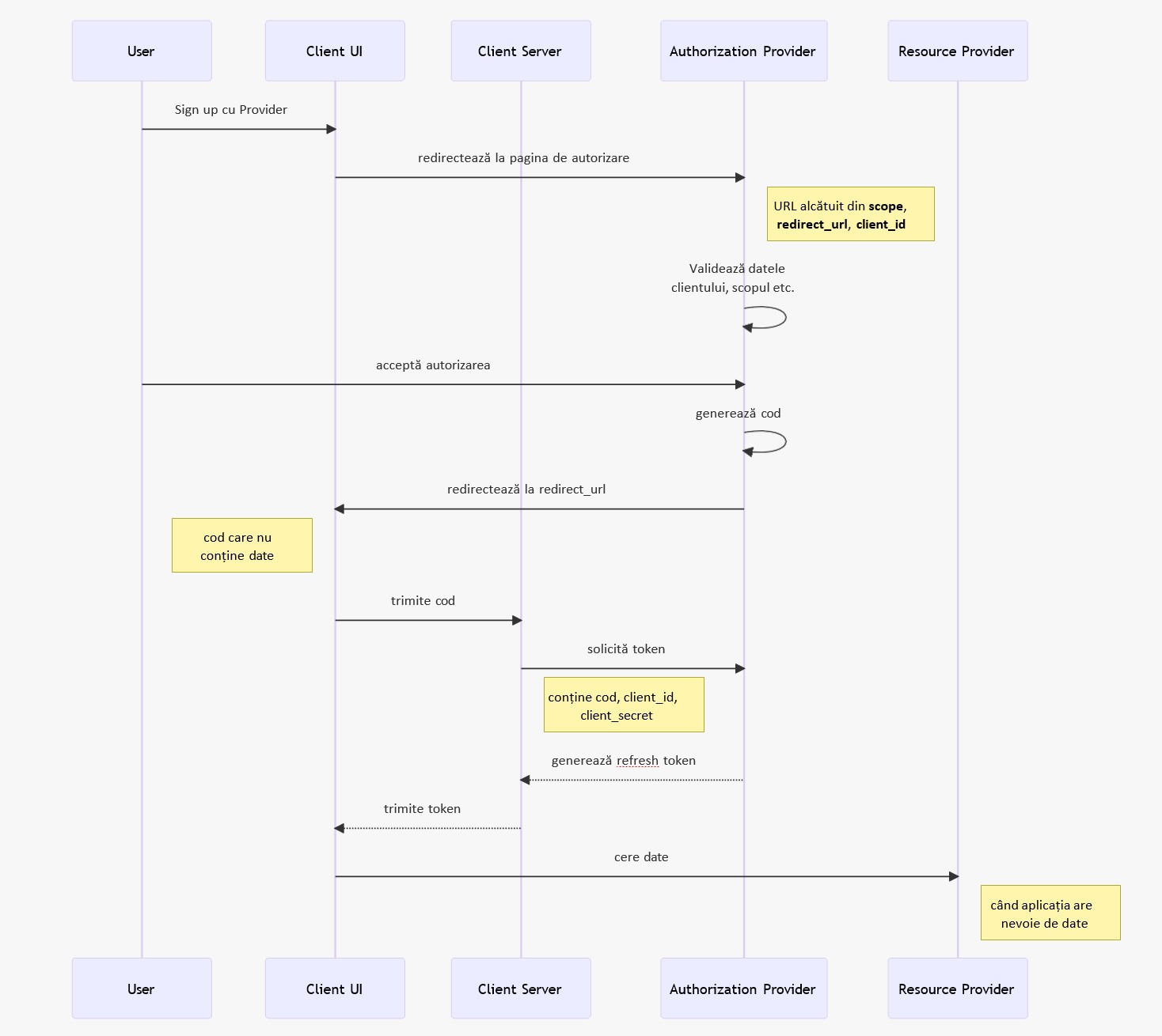 Authorization Code (Cod de autorizare): Acesta este un cod unic generat de serverul de autorizare în urma autentificării cu succes a utilizatorului. Aplicația client primește acest cod și îl folosește pentru a obține un token de acces.