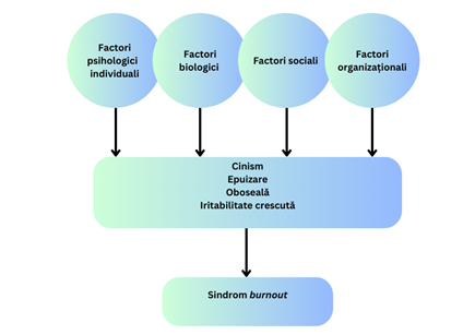 Cercetările ne arată că factorii sociali, individuali și cei biologici au o interacțiune complexă în procesul de formare al burnoutului. Nepotrivirea dintre persoană și mediu, globalizarea, competiția puternică și incertitudinea rolului corelat cu discrepanța dintre așteptări și realitate, toleranță scăzută la frustrare și o încordare ridicată duc la stres negativ. Ulterior, dacă acesta din urmă nu primește atenția necesară pentru a fi procesat emoțional, poate conduce la efecte adverse asupra sănătății.