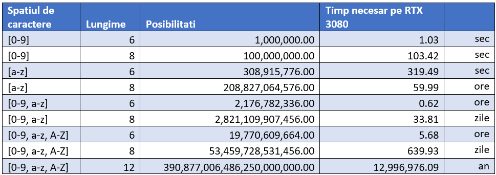 În tabelul următor sunt prezentați timpii necesari pentru un atac de tip brute force pe o placă video relativ performantă, precum RTX 3080, folosind ultima versiune a oclHashcat pentru calculul timpilor a fost folosit criptarea WPA2 pentru securizarea rețelelor wireless.