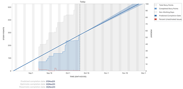 Pe măsură ce proiectul și Backlogul se dezvoltă, iar echipa estimează tot mai mult din taskurile rămase, ne putem folosi și de predicțiile deja existente în raportul din Jira - Version Report (Figura 3). Acest raport nu are în spate metoda Monte Carlo, ci se bazează pe media zilnică a velocității și a numărului total de Story Points pentru taskurile nefinalizate. Acest instrument vine în completare și ne ajută să conturăm mai bine data livrării.