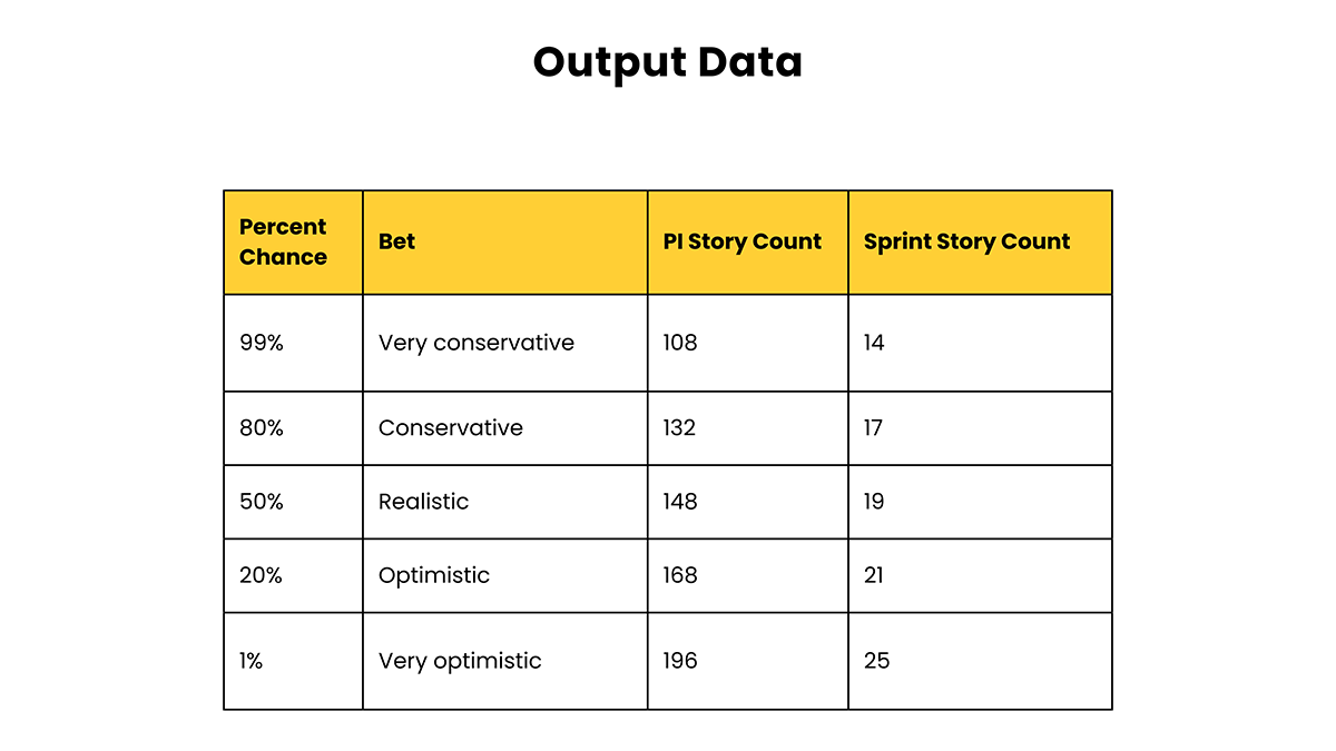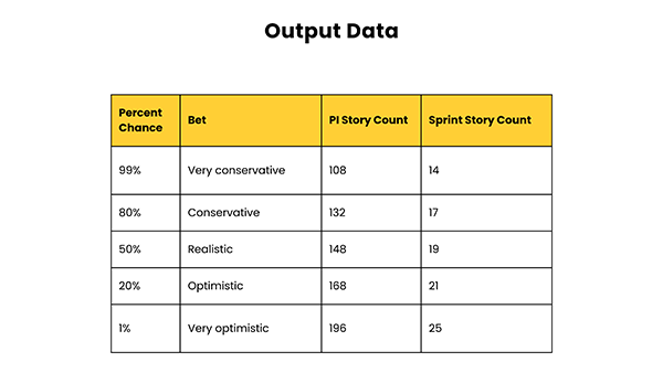 Exemplu: Ca echipă, suntem 80% siguri că vom reuși să livrăm un total de 132 de taskuri în timpul stabilit. Astfel, în fiecare iterație este probabil să finalizăm, în medie, câte 17 taskuri.