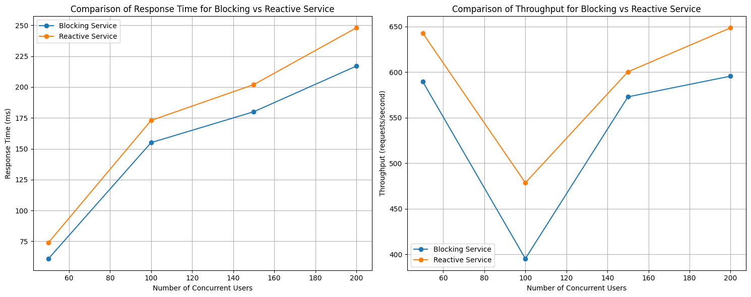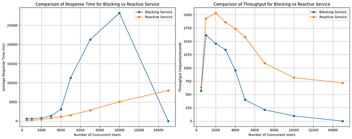 E de notat faptul că fiecare utilizator concurent a făcut trei operațiuni, deci numărul de apeluri este, în fapt, de trei ori mai mare pentru fiecare dintre cazurile testate. Se observă o creștere în timpul de răspuns asemănătoare celei exponențiale în cazul serviciului blocant, unde am experimentat o limită superioară de apeluri ce pot fi procesate de cca. 9.000-10.000 utilizatori concurenți (30.000 apeluri), moment de la care serviciul meu a început să producă erori precum închiderea conexiunii sau - și mai rău - s-a prăbușit complet.