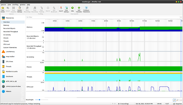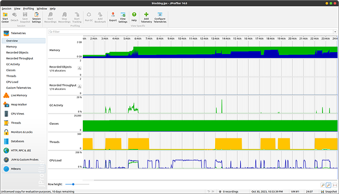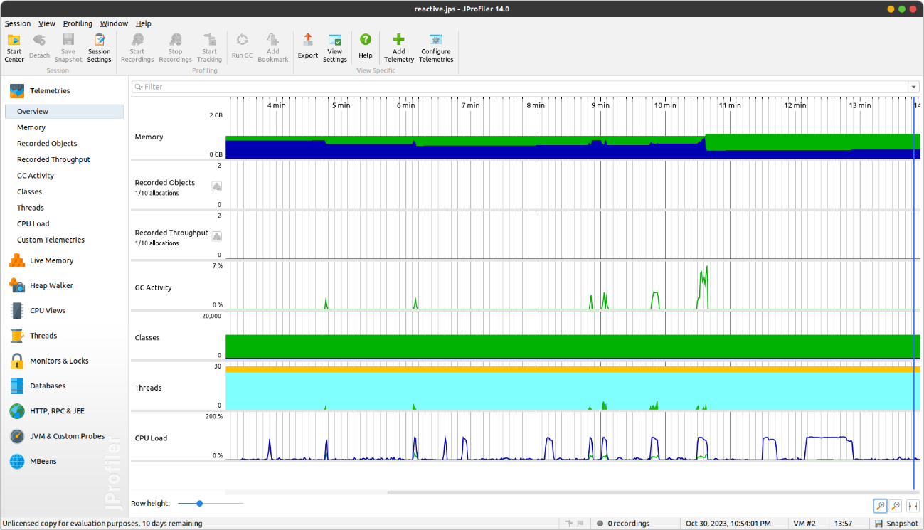 Dincolo de compararea metricilor de timp de răspuns sau randament cu JMeter, un alt aspect interesant este evidențiat de profilarea celor două servicii și de monitorizarea bazei de date. Utilizând JProfiler pe tot parcursul testelor, am observat, precum mă așteptam, o diferență mare când vine vorba atât de numărul de threaduri create, cât și a numărului de threaduri active în mod concomitent, respectiv blocate în momentul procesării. Figurile de mai jos evidențiază acest lucru, unde este de notat că vârfurile apărute în diferitele metrici coincid cu momentele de testare cu un număr mare de utilizatori.
