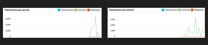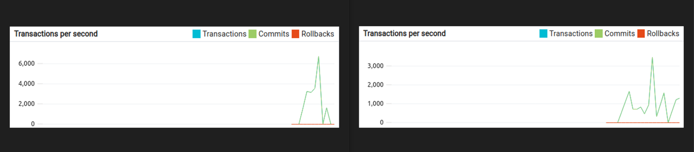 O ultimă metrică interesantă a fost cea legată de numărul de tranzacții pe bază de date, evidențiind diferențele masive între driverul reactiv, respectiv cel blocant folosit în servicii. O captură a metricilor din dbAdmin arată faptul că în urma unui test cu 5000 de utilizatori concurenți, numărul de tranzacții pe bază de date pe minut este de două ori mai mare în cazul reactiv.