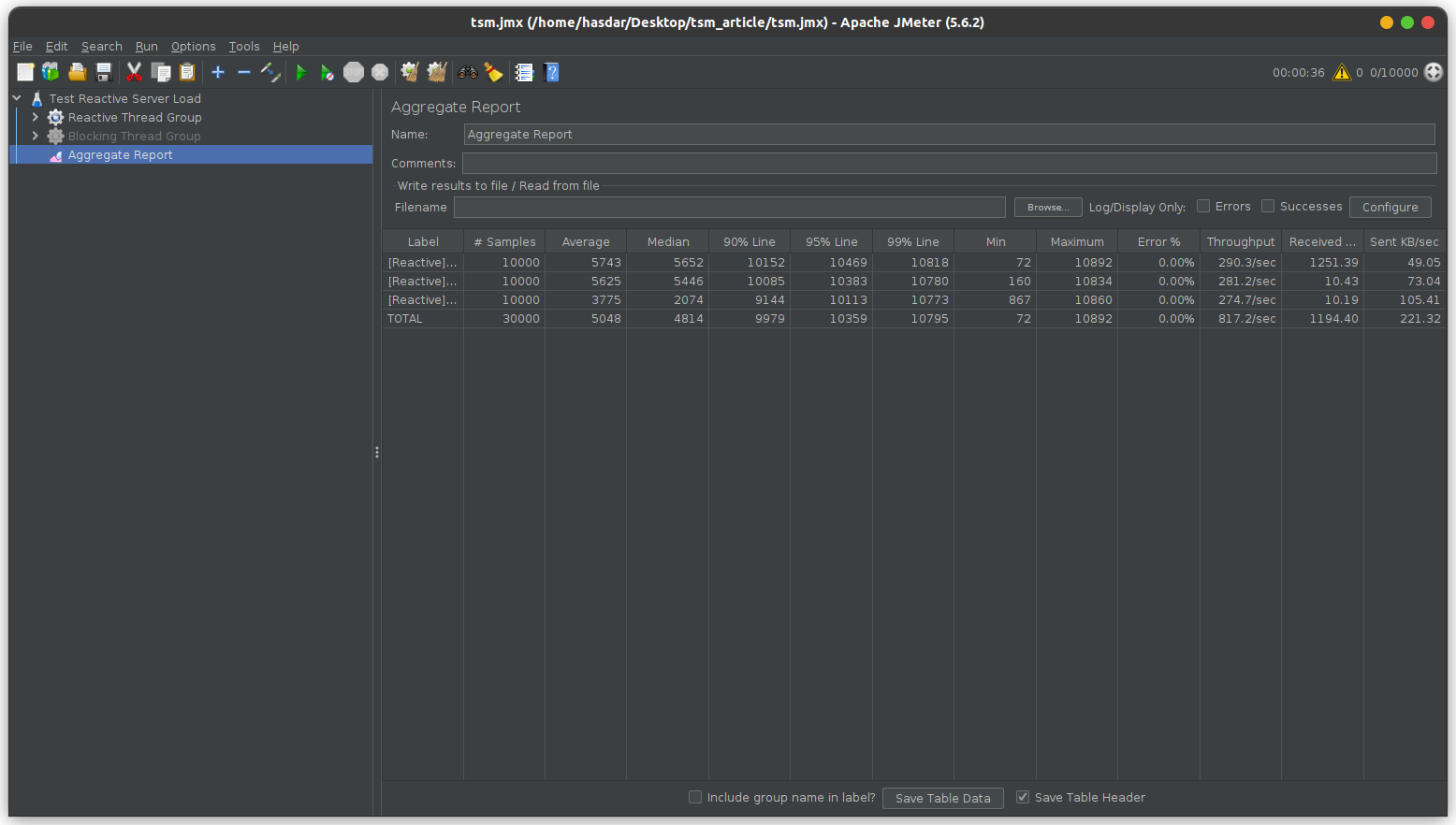 Figura 3. Test simulând 10.000 utilizatori concurenți ai serviciului reactiv