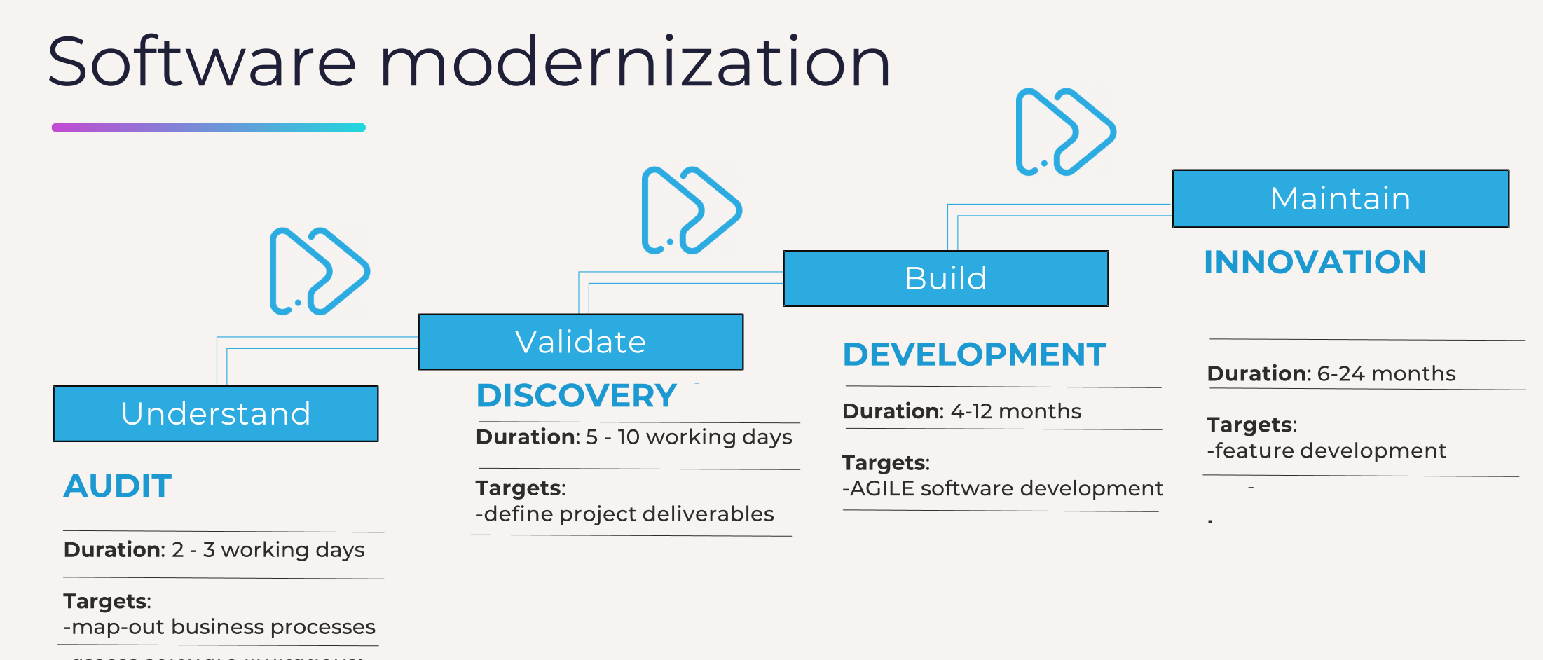 Este esențial ca furnizorii de servicii software să realizeze că nu trebuie să se limiteze doar la simpla modernizare, ci să orchestreze o tranziție fără probleme la noua soluție propusă, asigurând desfășurarea continuă a operațiunilor de business ale clientului.