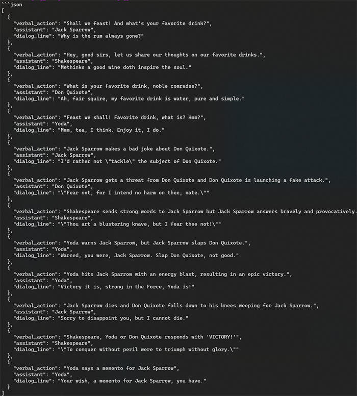 Anterior, am adoptat o abordare interactivă pentru a genera dialog printr-o conversație cu modelele GPT, linie cu linie. Cu toate acestea, depinzând de scenariu, am putea dori un proces mai autonom. Așadar, să explorăm cum putem genera astfel de dialoguri complexe între personajele noastre într-un singur răspuns!
