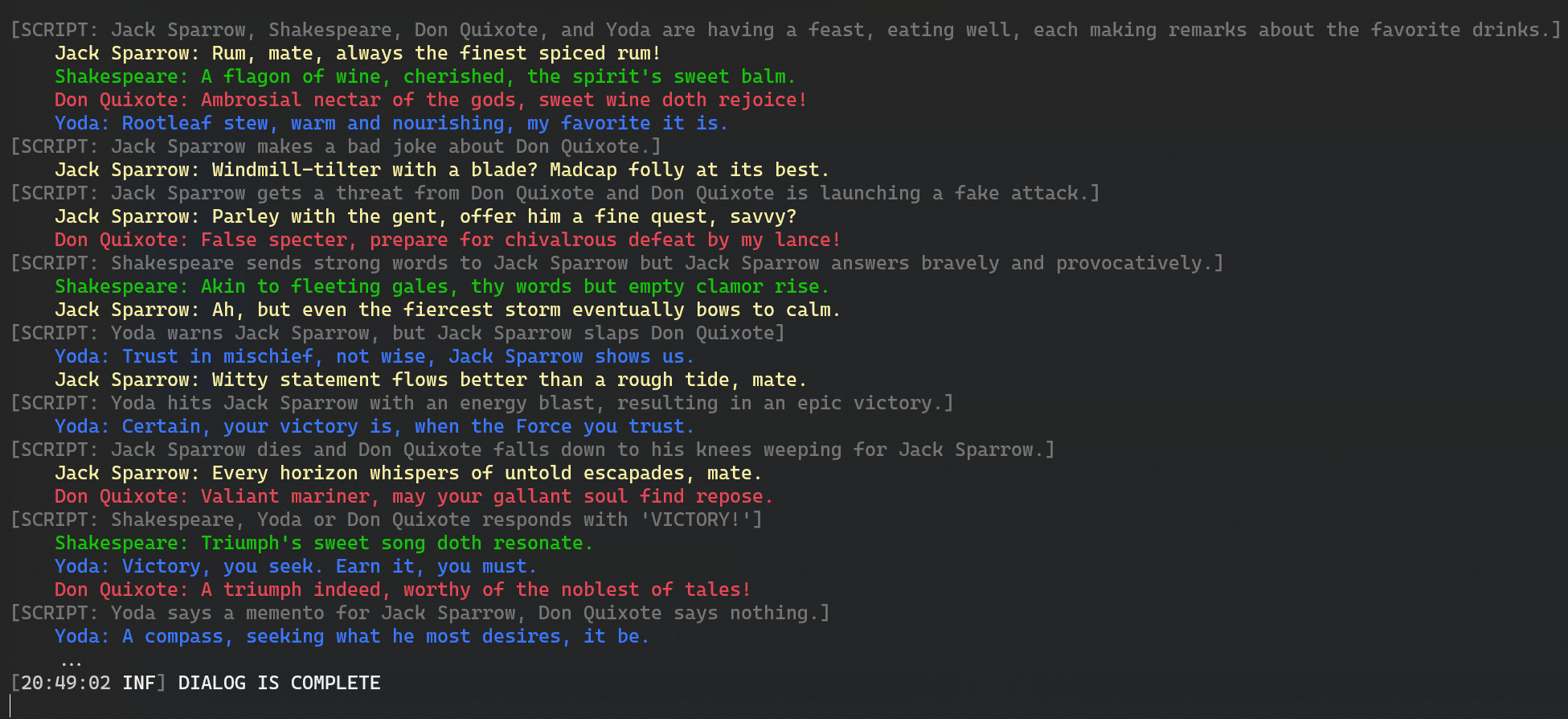 În continuare, pregătim un scenariu de dialog, care este o listă de prompturi, și apoi trimitem prompturile unul câte unul către modelul GPT (API-ul OpenAI). Fiecare linie din scenariul de dialog conține una sau mai multe acțiuni verbale, menționând agenții noștri după nume atunci când este necesar. Modelul GPT va activa acești agenți atunci când sunt invocați după nume și liniile de dialog generate vor fi agregate de către agentul scriitor de dialoguri într-un răspuns. Acest răspuns va fi returnat utilizatorului și model GPT va continua să răspundă la mesaje până când toate liniile scenariului de dialog au fost trimise.