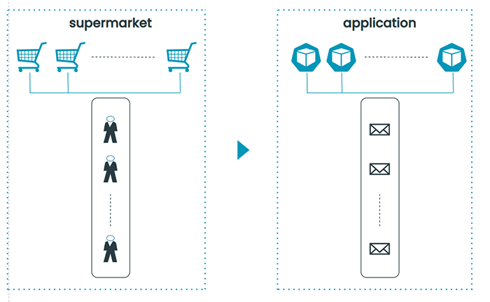 Revenind de la acest exercițiu de gândire, vom încerca să transpunem problema într-o aplicație software. Înlocuim cumpărătorii cu mesaje care trebuie procesate, casierii cu containerele noastre și coada cu un queue (Kafka, RabbitMQ etc).