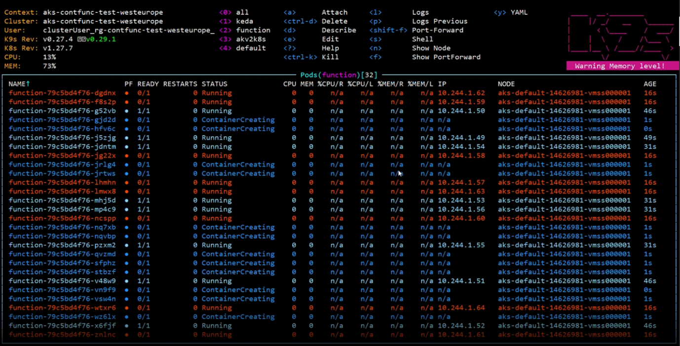 Singurul pas care ne-a rămas este să testăm dacă scalarea are loc așa cum ne așteptăm. Pentru a testa, vom trimite un număr uriaș de mesaje (10000) deodată în queue din portalul Azure. După câteva secunde, surprinsă de ultimele evenimente întâmplate, KEDA receptează schimbarea majoră care a avut loc la nivelul lungimii queue-ului și începe să ridice automat și rapid o întreagă flotă de Poduri pentru procesare. În imagine, am crescut numărul maxim de Poduri la 50 pentru a vizualiza mai ușor "cireașa de pe tort".
