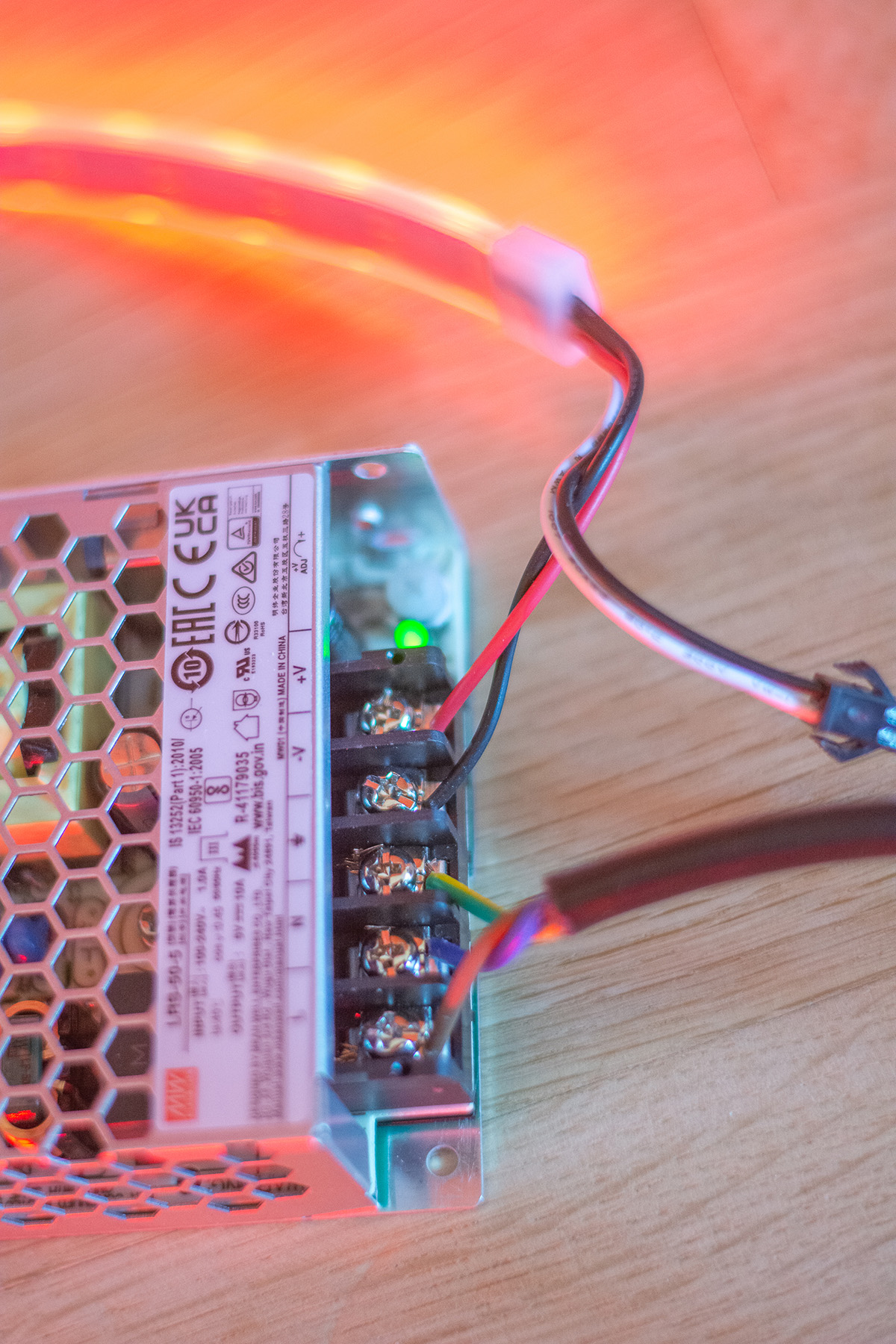 Date fiind cerințele de curent (5V și 10A) a trebuit achiziționată o sursă specială. Am optat pentru Mean Well LRS-50-5, 5V/10A. Aceasta vine fără o conexiune la priză așa că trebuie să luăm un cablu de alimentare de la un calculator și să le conectăm la sursă. Dacă nu am greșit nimic, ar trebui să se aprindă un led verde pe sursă.