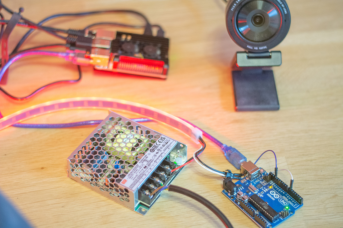 Lumina este unul dintre cele mai spectaculoase elemente pe care le putem controla în proiectele IoT. Proiectul de față vă propune să controlăm o bandă cu leduri de 4 m cu ajutorul unui Arduino conectat serial la un RaspberryPi 5 care procesează datele primite de la o cameră web. Funcționalitatea de bază constă în schimbarea culorilor ledurilor în funcție de starea celui care stă în fața camerei.