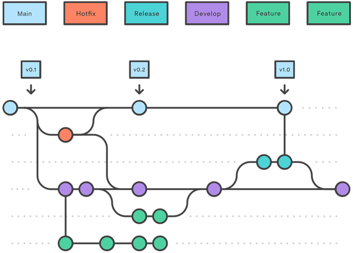 Să trecem în revistă poate cel mai folosit model de integrare a funcționalităților: git flow. Un model extrem de bine organizat, de a cărui strictețe depind probabil multe produse.