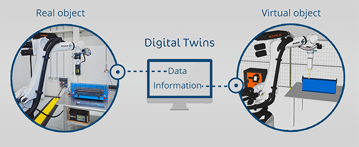 Datorită comunicării în timp real dintre obiectul real și cel virtual, putem crea o perspectivă panoramică asupra proceselor industriale în timpul desfășurării acestora. Astfel este posibilă monitorizarea acestora prin actualizări instantanee a modelului virtual dar și a aplicării de măsuri corective prin prisma controlului asupra obiectului real [4].