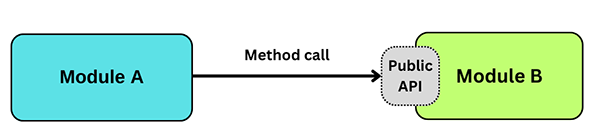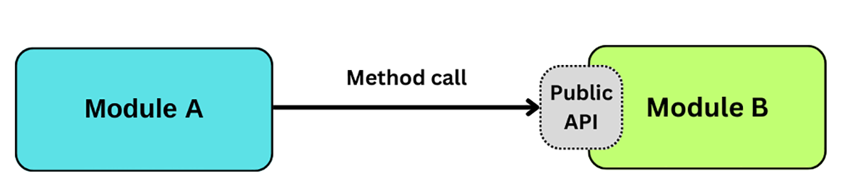Primul și cel mai ușor tipar de comunicare este cel realizat prin method calls (apelare de metode) între module. Method calls sunt sincrone și foarte rapide, deoarece acestea au loc in memory (în memorie).